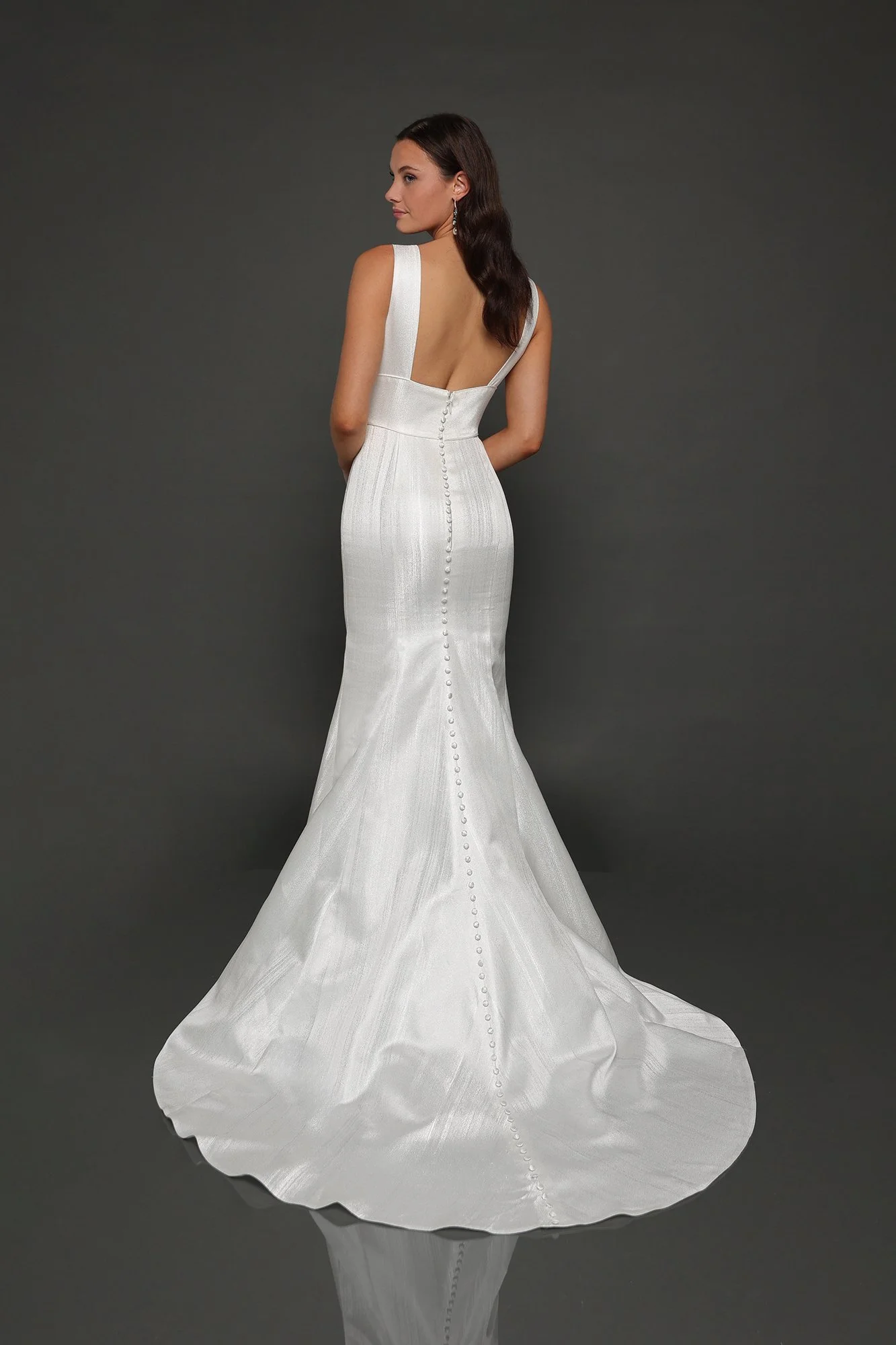 Low front and back squared neckline Satin faced Waterfall Jacquard modified mermaid gown with underbust inset waistband trimmed in piping, chapel train and buttons to hem.