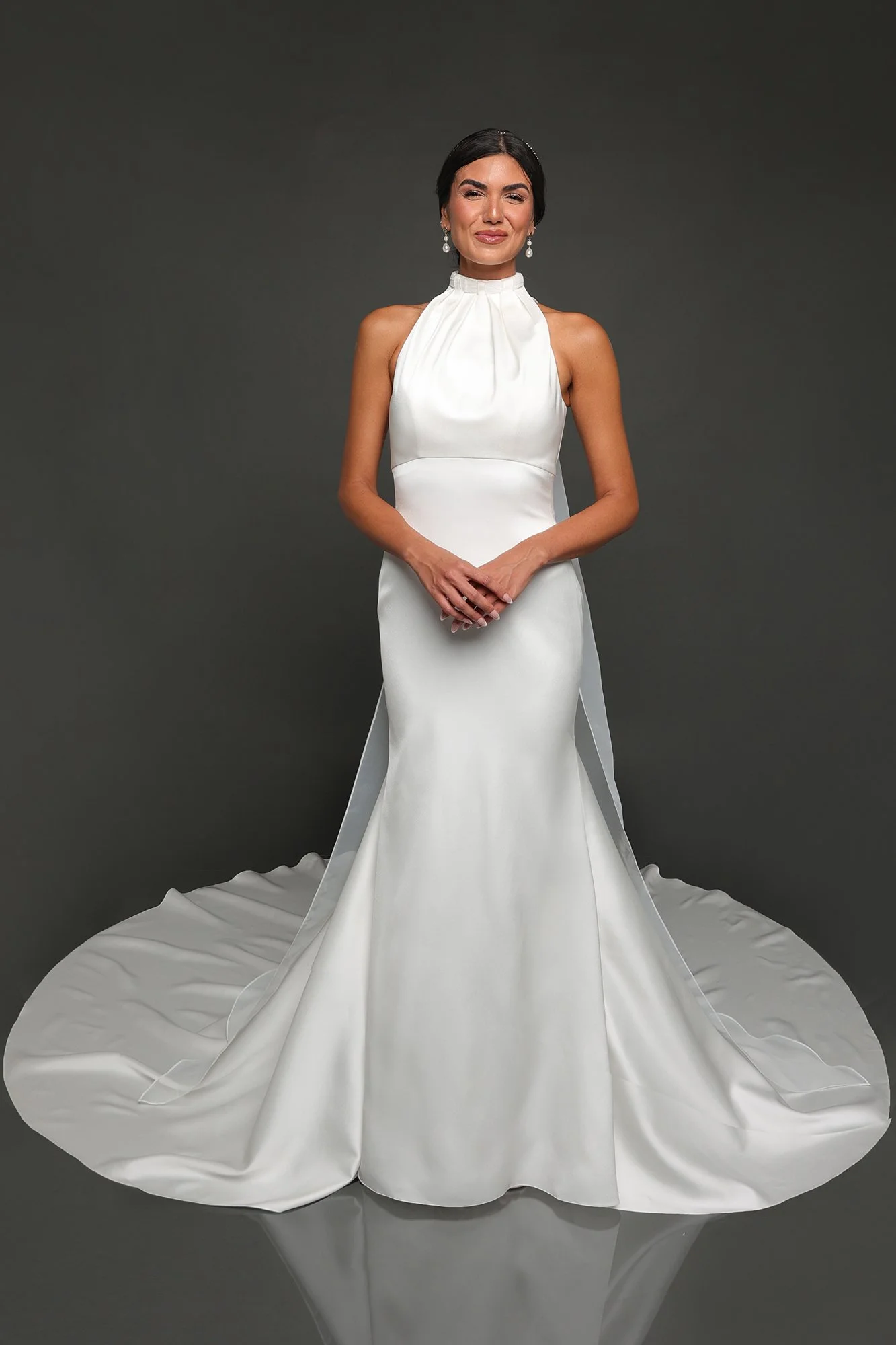 High neck halter, empire waist Charmeuse mermaid gown with Organza tie, extended train, and buttons to the hem.