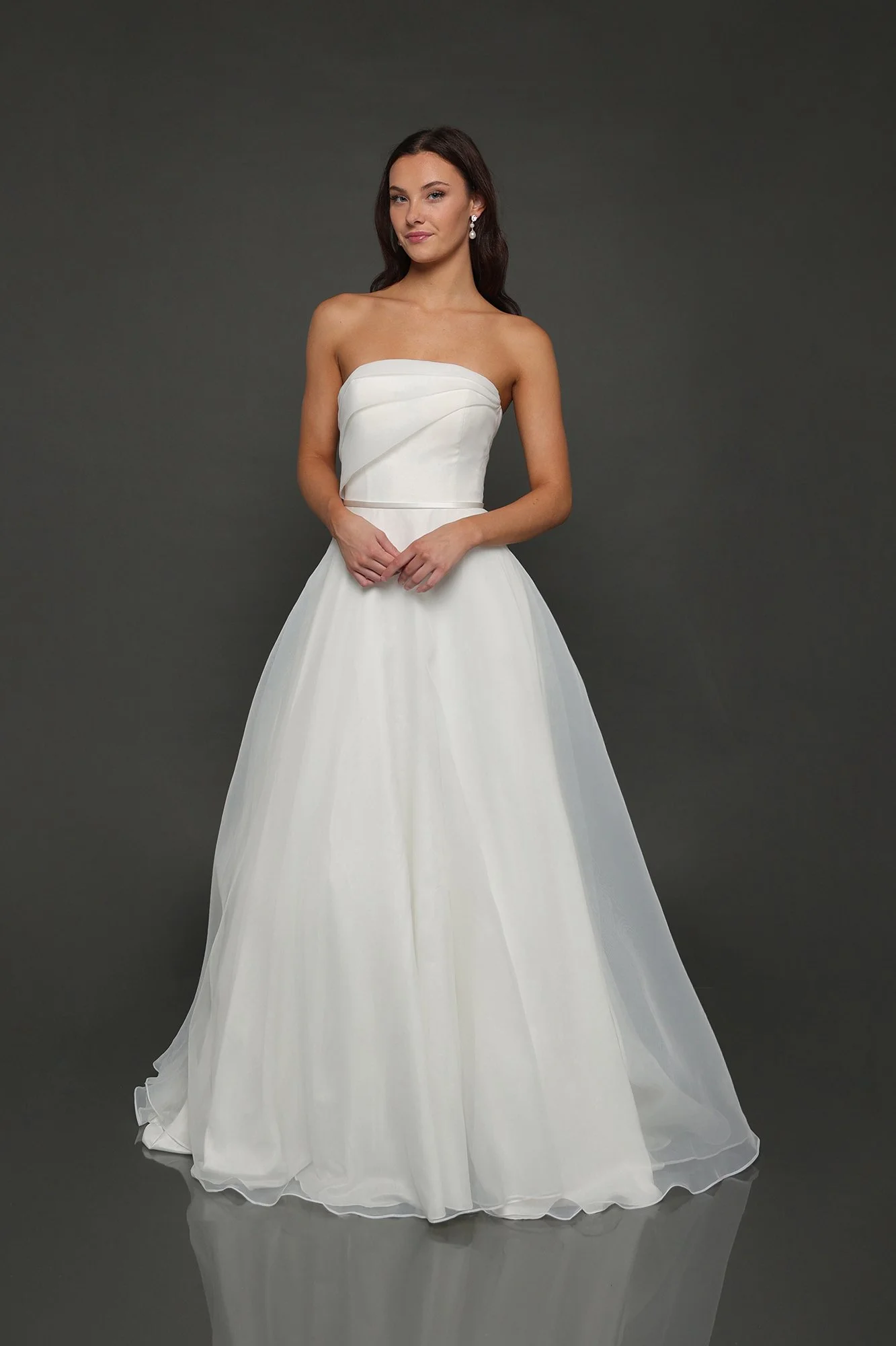 Organza strapless straight across neckline A-line wedding gown with asymmetrical pleats on bodice, natural waist, sweep train, satin belt, and buttons to hem.