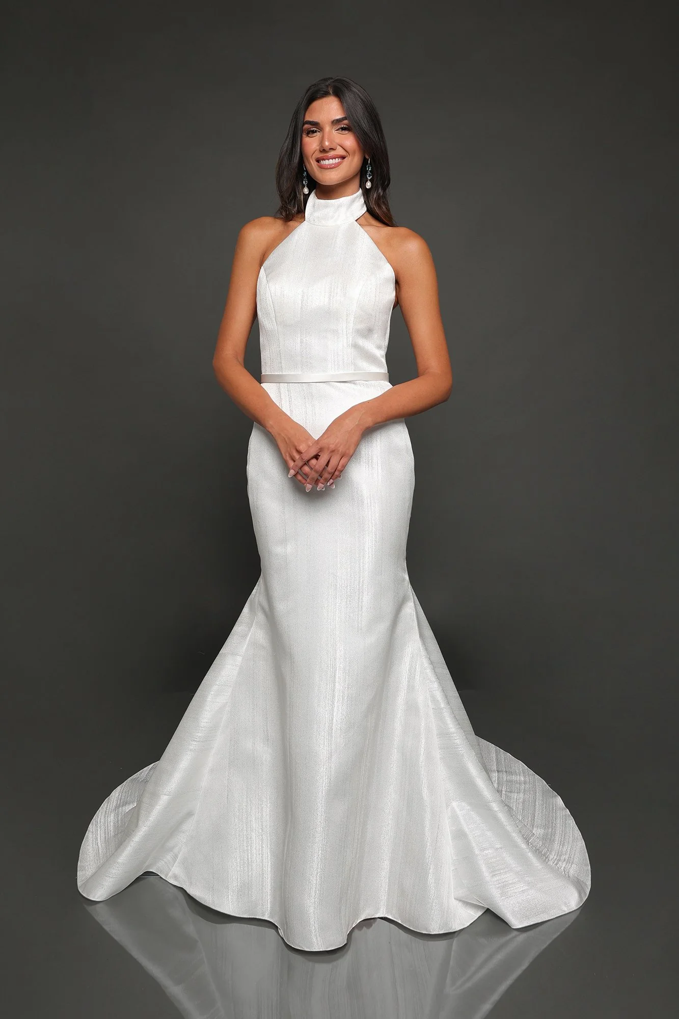 Halter Satin faced Waterfall Jacquard mermaid gown with half circle godet skirt, chapel train, satin belt and buttons to hem.