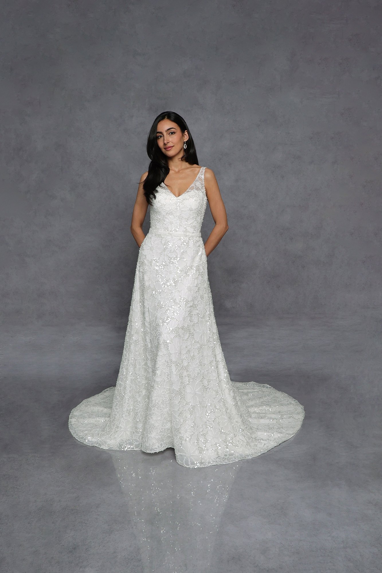 V-neckline beaded and embroidered organza slim A-line gown with covered buttons to the end of the cathedral train.