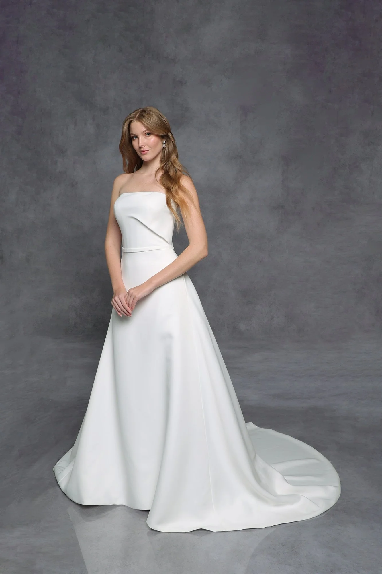 Strapless straight across neckline with single asymmetrical side pleat, natural waist slim a-line gown in Satin-faced Crepe, and buttons to hem.