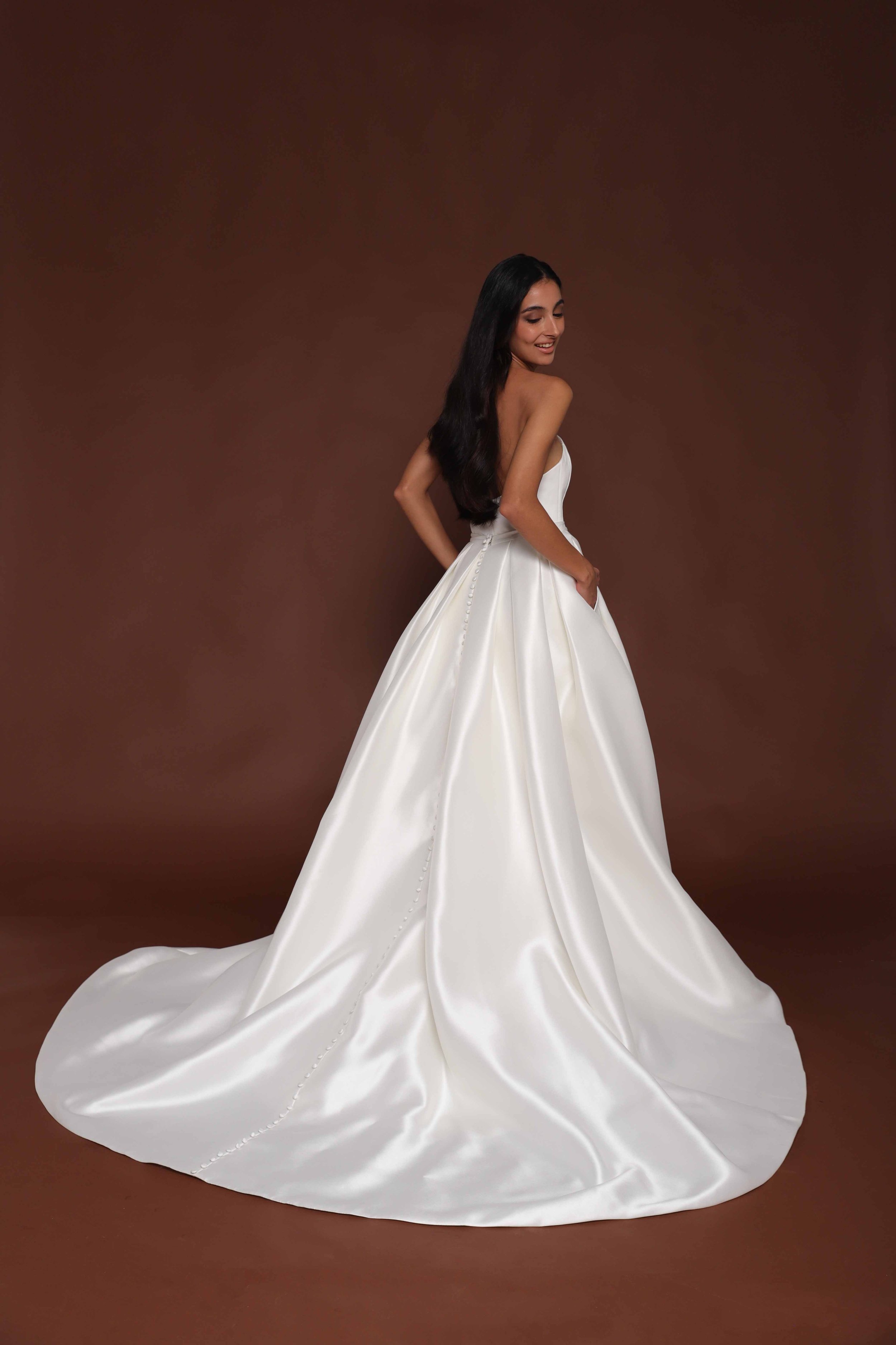 Egret Overskirt Open front Mikado overskirt with box pleats, one-inch waistband and buttons to the end of the train.